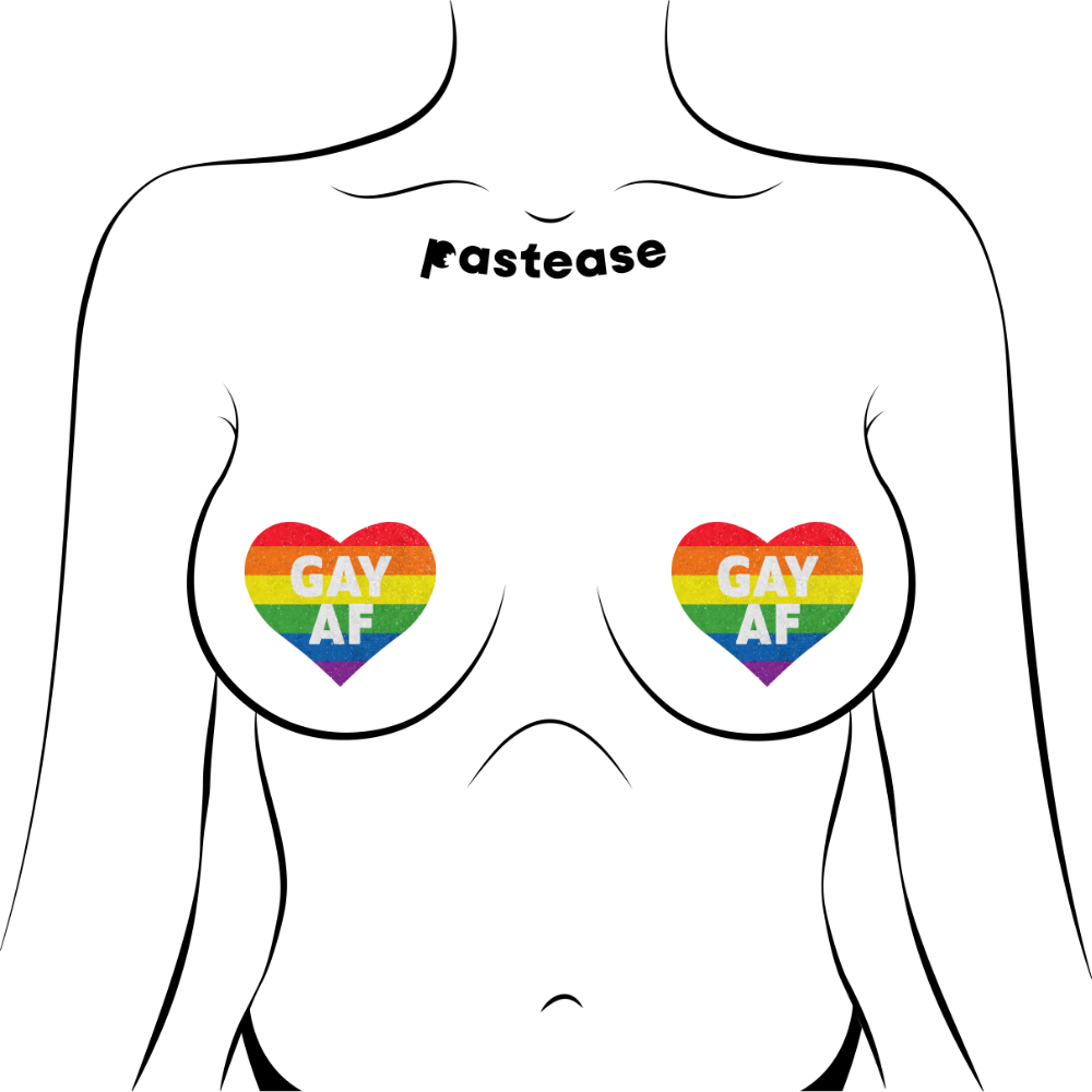 YYY5:-Pack: Love: Rainbow 'GAY AF' on Glitter Velvet Heart Nipple Pasties by Pastease®YYY
