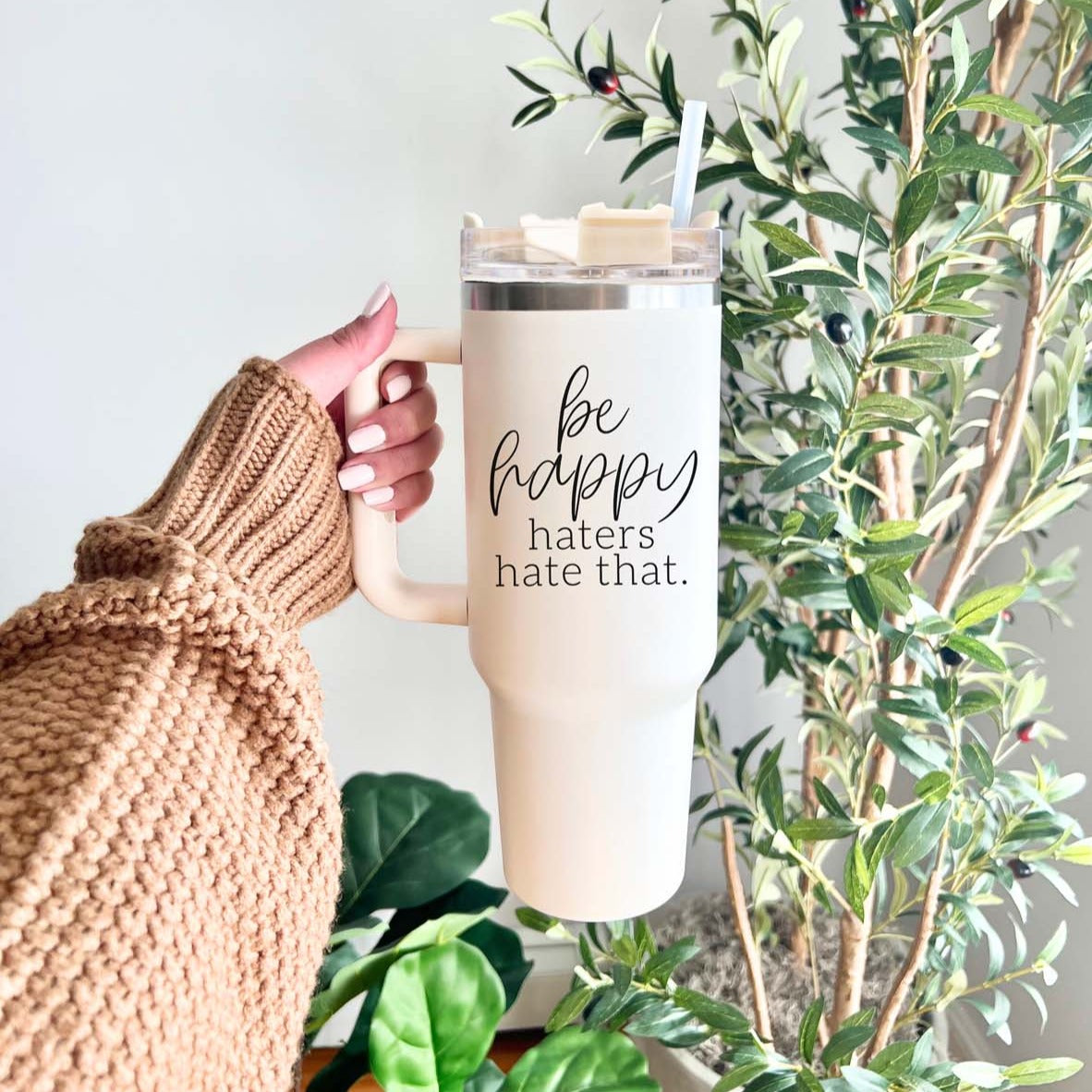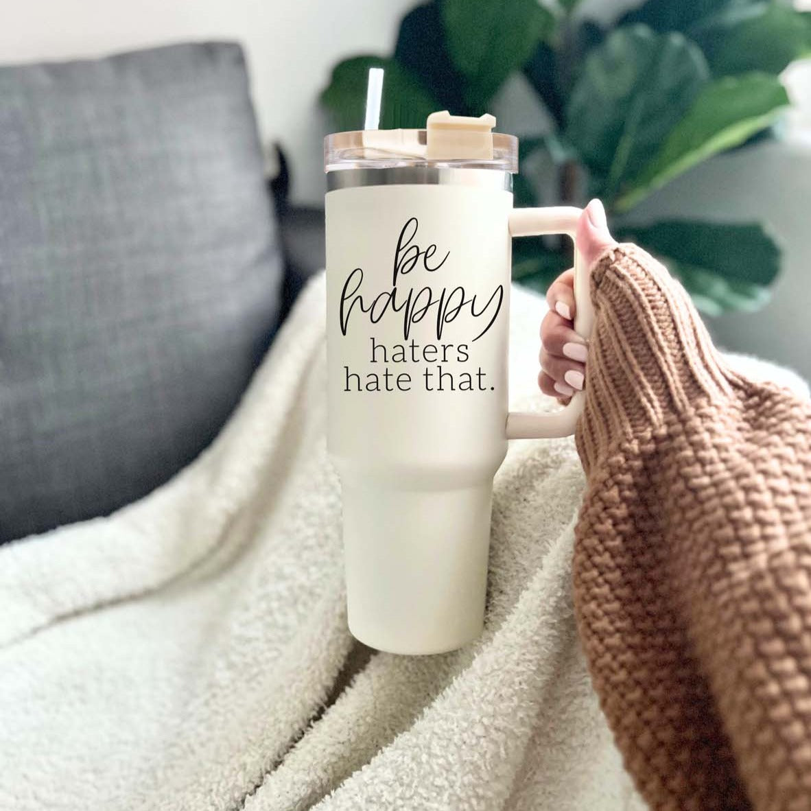 Be Happy Haters Hate That Insulated Mug with handle, lid and straw