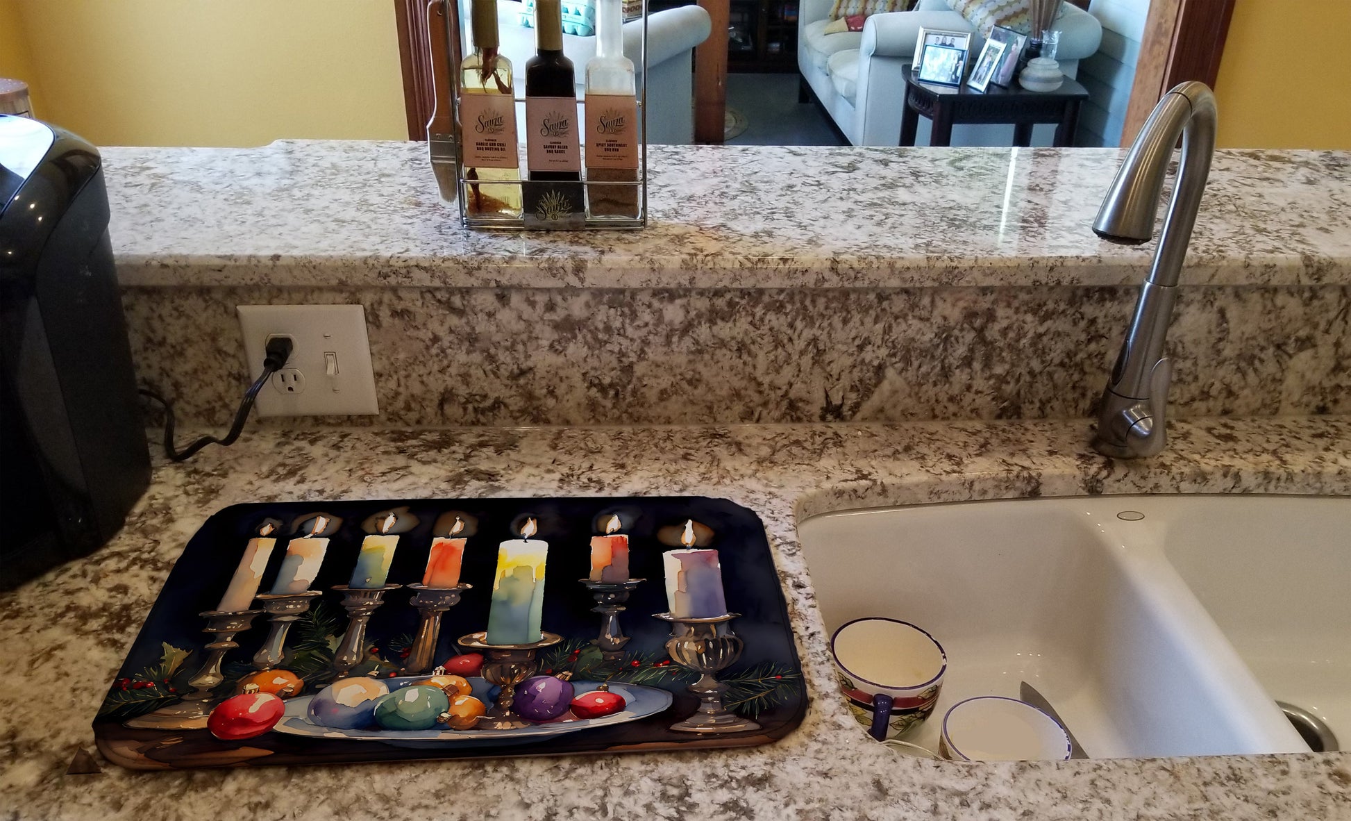Celebrate Christmas with this Christmas Dish Drying Mat. Say goodbye to messy countertops and soggy dish towels with our innovative dish drying mat. Our high-quality dish drying pad is designed to keep your countertops dry while offering a stylish and efficient solution. Whether you're air drying dishes, glasses, stemware, silverware, pots, pans, bottles, or even fruits and vegetables, our dish mat is the perfect choice. The 14 inches x 22 inches size fits most counters and dish drying racks, and the non-slip design ensures stability. Made with water-absorbent polyester and a polyurethane foam insert, our dish drying mat is not only functional but also durable. It's machine washable and printed in the USA for long-lasting use. The beautiful artwork adds flair to your kitchen decor, making it a perfect housewarming gift or present for any occasion. Upgrade your kitchen experience with our absorbent and versatile dish drying mat.