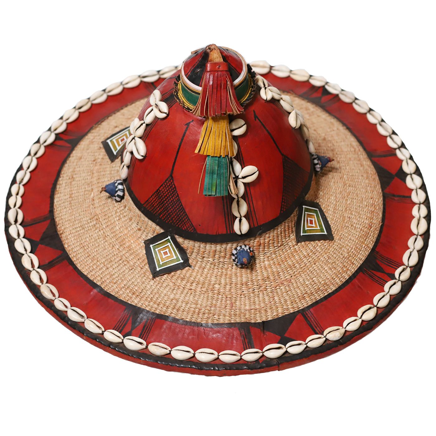 Our Fulani hat is made out of an organic plant fiber with leather applications and Cowrie shells.  At the base of the hat there is a chinstrap with a tassel at the end.  Handmade by Fulani artisans in Mali.  No two are the same due to the nature of handmade.  This is also a great wall decor!