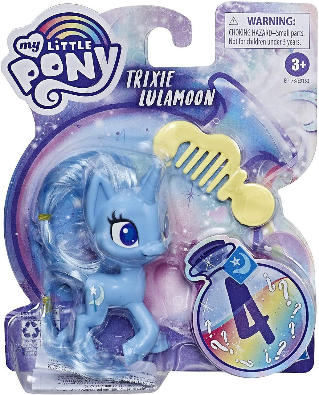 Reveal the magic with Trixie Lulamoon! The self-proclaimed "Great and Powerful Trixie" is a mischievous pony and powerful magician! This Trixie Lulamoon Potion Pony 3-inch figure is a blue pony toy with a blue mane and tail. The figure comes with a comb and 4 surprise hair play accessories. Tear open the potion bottle-themed pack and pour out the accessories for styling her long brushable hair! Trixie Lulamoon Potion Pony features a reimagined form factor for a fresh and adorable take on the character's original design in My Little Pony entertainment. Also, look for Fluttershy, Twilight Sparkle, Applejack, Pinkie Pie, and Potion Nova figures to share accessories and imagine adventures in Equestria! (Each sold separately. Subject to availability. ) My Little Pony and all related characters are trademarks of Hasbro.