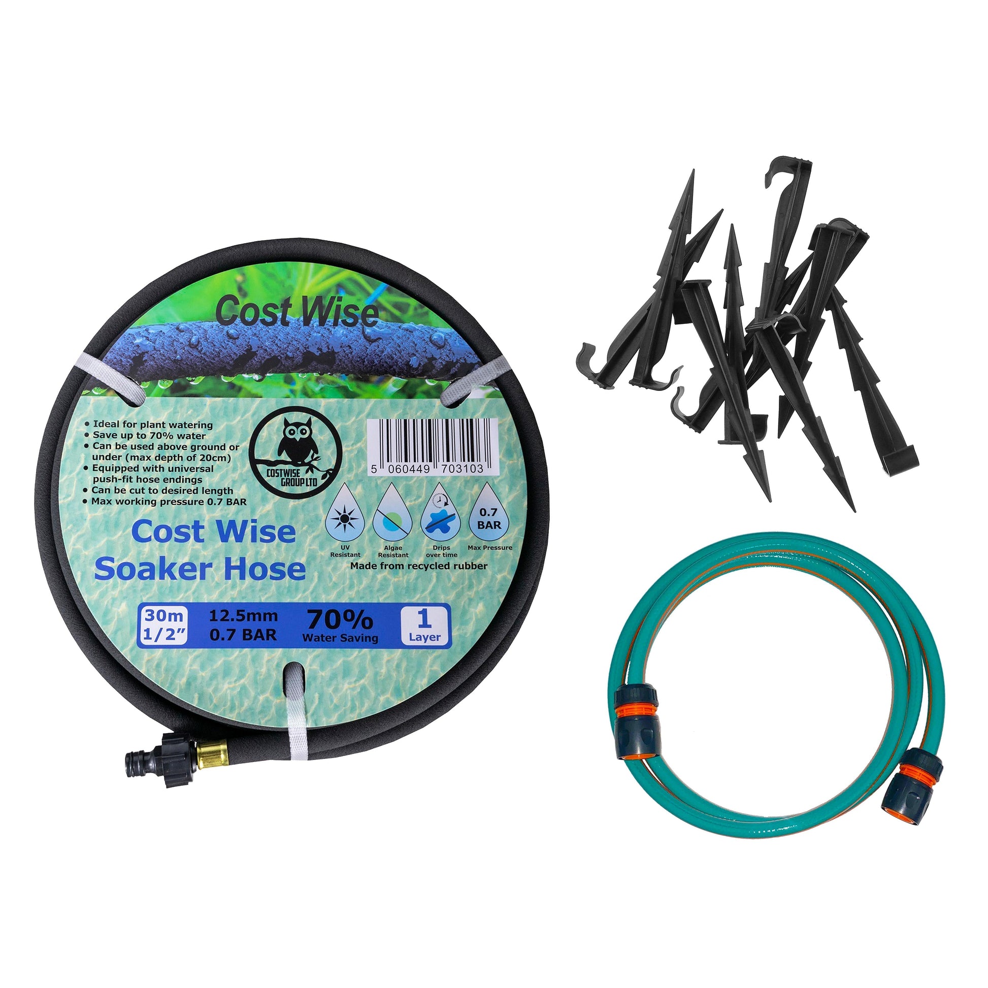 The Cost Wise flexible 1/2" Soaker Hose is an eco-friendly irrigation solution made from 100% recycled rubber, offering durability, flexibility, and UV and algae resistance for long-lasting performance. Designed to save up to 70% of water compared to traditional methods, its porous structure allows a gentle, consistent flow directly to plant roots. Suitable for agriculture, landscaping, and horticulture, it can be used above ground or buried up to 20cm. The hose is customizable in length and delivers 0.76β1.26 litres per minute per meter at 0.7 BAR. Not for drinkable or hot water use, it ensures efficient, sustainable watering while minimizing waste.