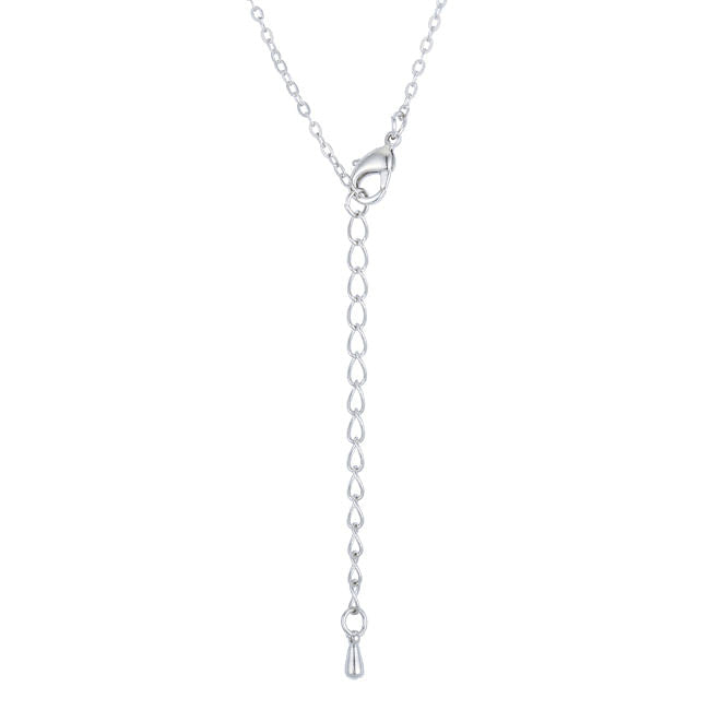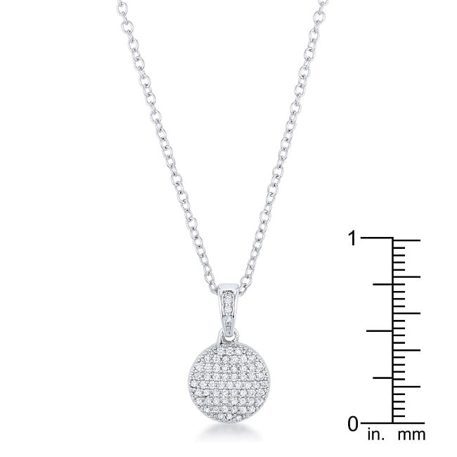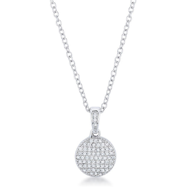 This incredible necklace is crafted with rhodium plating the same metal and process that give white gold its shine. The lovely disc is set with round cubic zirconia so it shimmers beautifully when worn. Some necklaces accent an outfit. This necklace makes a statement and the statement is beautiful.