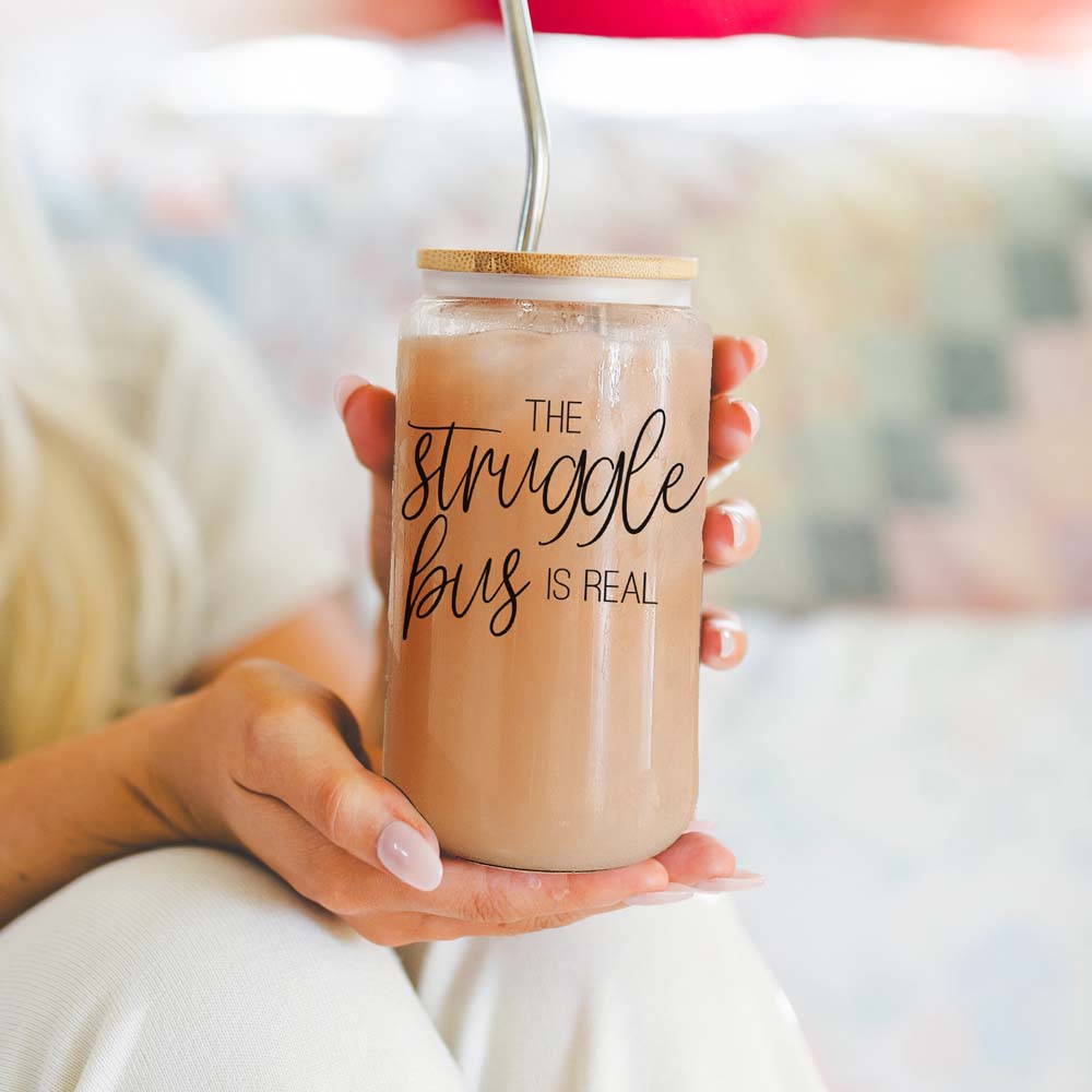 Our glasses with bamboo tops. Drink it with the top and straw of choice, remove the bamboo lid and drink straight from the glass.