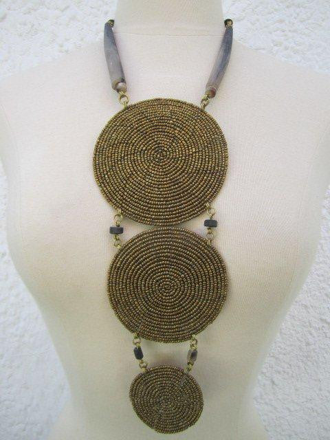 Triple disc necklace with horn around the neckline. This is a beautiful beaded metallic gold necklace.