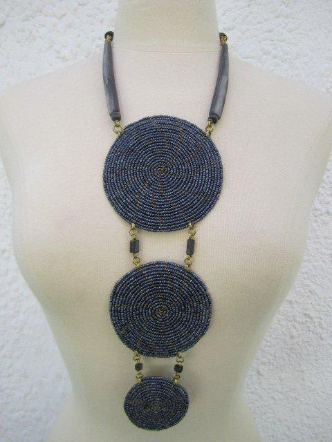 Triple disc necklace with horn around the neckline. This is a beautiful beaded metallic grey necklace.