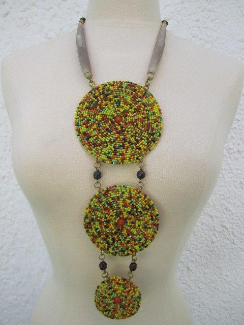Triple disc necklace with horn around the neckline. This is a beautiful beaded rasta color necklace.