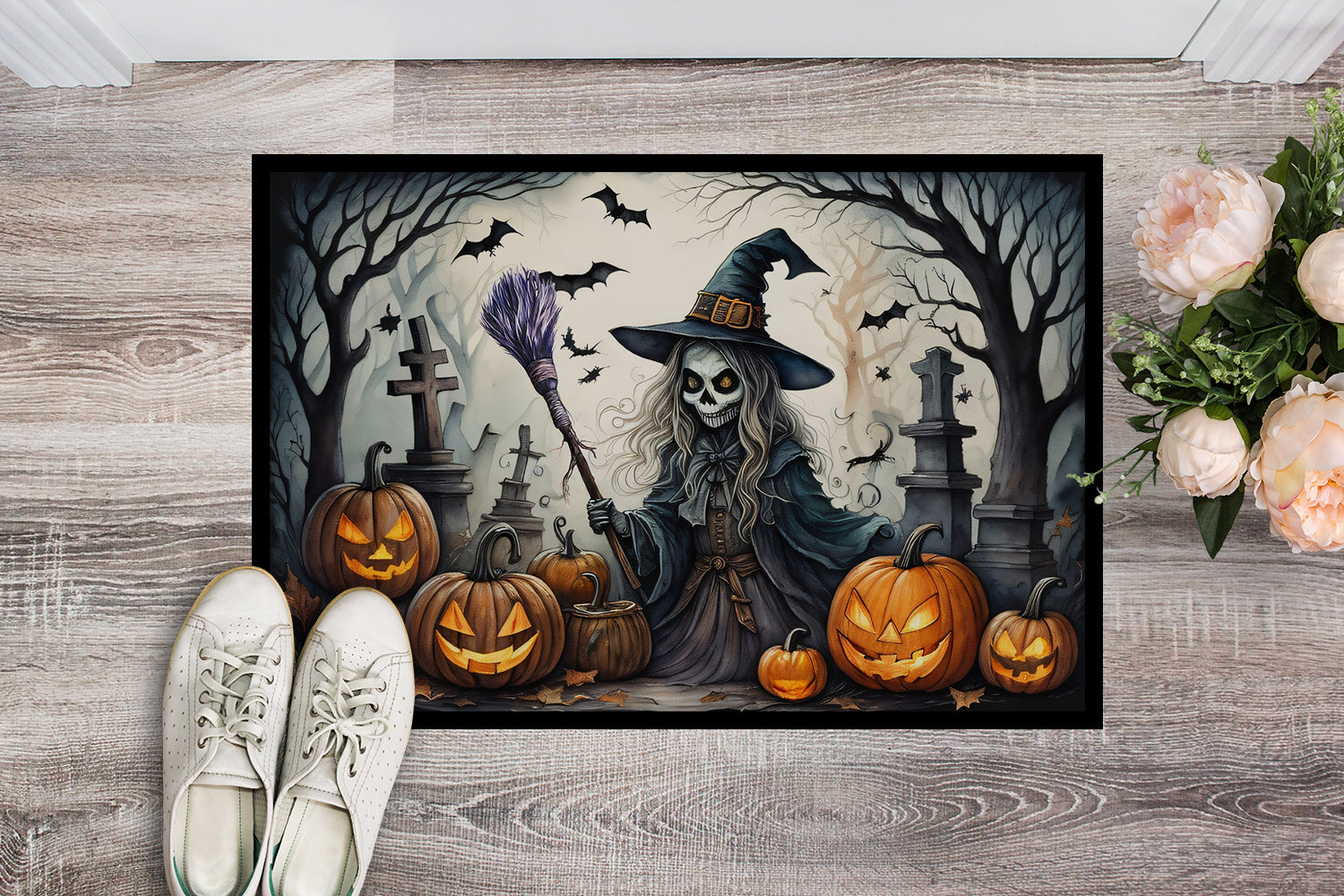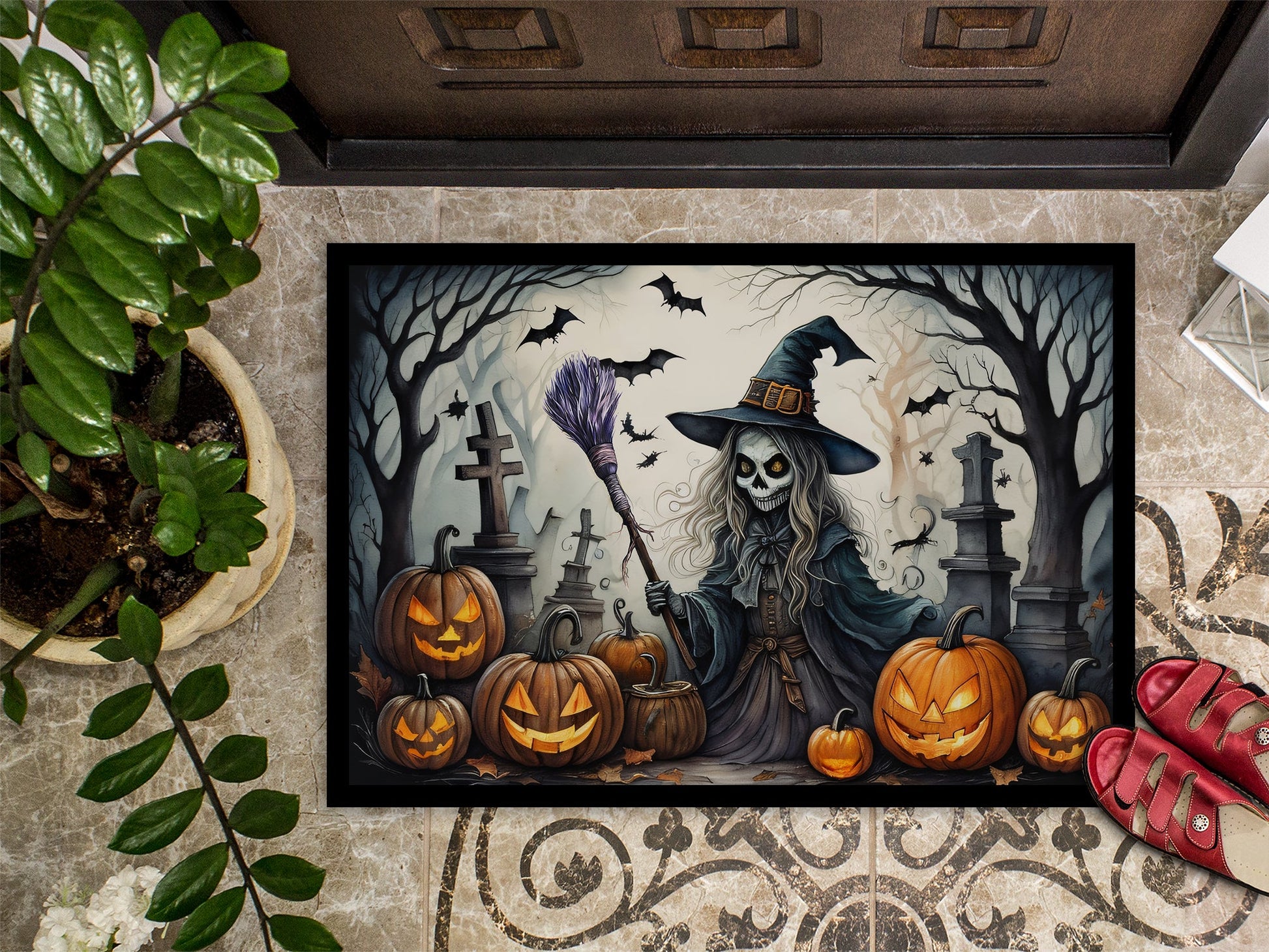 Celebrate Halloween with this Halloween Doormat. Welcome your guests in style with our Artwork Door Mat, designed to withstand almost any weather condition. This mat, measuring approximately 18 by 27 inches, is held together by durable black binding tape. Its top layer, composed of polyester felt, is dyed with the eye-catching image you see on the mat. A few layers below provide the mat with stability, while its rubber bottom is stamped to help prevent slipping and ensures safety. Our mat works wonderfully as both an indoor or outdoor door mat. For cleaning, simply hose it off with water or use a power washer - no need for any cleaner that produces suds. Avoid scrubbing with a brush, instead, opt for the vacuum on floor setting. Designed manufactured and printed in the USA, this mat is a perfect addition to your porch, outdoor kitchen, entryway, or any indoor space. Its unique design makes it a charming decorative rug that greets your guests and adds a stylish touch to your home decor.